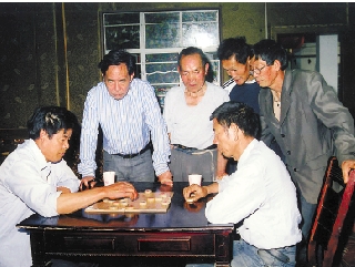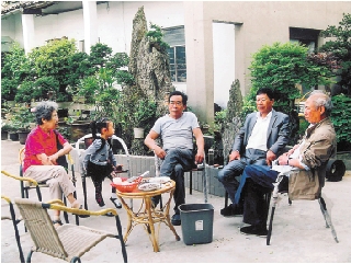 胡教群(右一)和弟妹在胡教明(中)创办的“同乐园”内谈天。