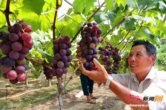 宁海新闻网讯 “满架高撑紫络索,一枝斜亸金琅珰。”时下又到葡萄成熟季节,昨日上午,桥头胡街道金牛山自然村的钟锡恩正在喜摘红富士葡萄。今年65岁的钟锡恩是村里最早从事葡萄种植的人,至今已有近30年的历史,目前他家种有葡萄18亩,品种有醉晶香、红富士、夏黑、藤稔等,按目前市场价每公斤10-12元计算,钟锡恩今年收入预计可达20余万元。(李江林李巧萍摄) |