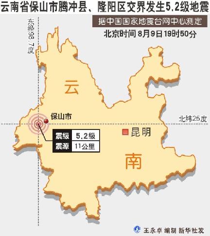 2011年8月9日图表:云南省保山市腾冲县、隆阳区交界发生5.2级地震王永卓编制新华社发 新华网昆明8月10日电(记者吉哲鹏颜牛)记者从云南省民政厅获悉,截至10日凌晨3时,9日晚发生在云南省保山市腾冲县芒棒镇的5.2级地震致3人受伤,其中1人重伤。据初步统计,地震造成10474户、44341人受灾。 至10日2时许,在此次地震中受重伤的伤员已被送至腾冲县人民医院紧急救治,目前生命体征稳定。轻伤员在当地卫生院接受包扎后出院。 据初步统计,此次地震造成保山市腾冲县、龙陵县和隆阳区30个乡镇10474户、44341人受灾。目前当地已紧急转移安置灾民441人。 初步调查,灾区民房不同程度受损22823间,教育、卫生、交通、水利等基础设施受损。详实灾情正在进一步核实统计当中。 目前,公安、消防部队及应急救援队480余人已赶至灾区开展救援工作,救灾工作正在有序进行中,灾区社会秩序稳定。 |