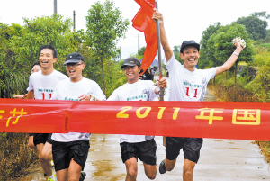 昨天上午,由东南商报社发起,联合宁海县相关部门共同举办的2011国际(宁海)驴友节在宁海开幕。通过商报征集的29支队伍、145名驴友参加竞技,最终牛群户外俱乐部获得一等奖。图为牛群户外俱乐部选手到达终点欣喜若狂的情景。