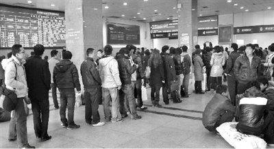 昨天,在郑州火车站售票大厅内,购票的旅客们排起了长队。 当天,在郑州火车站售票大厅,记者看到,整个大厅30多个窗口前都排着长队,均超过了20人,最长的队伍有近百人,已经排到了大门口。 按照铁道部最新修订的《铁路旅客运输服务质量标准》要求,各车站要开启数量充足的售票窗口,日常购票排队等候不超过20人。但目前的实际情况是,国内大多数客流量较大的车站都无法达到这一要求。 对于新《标准》中要求的“不超过20人排队”该如何实施,郑州火车站的工作人员称,他们暂时还没有具体措施。新华社发 |