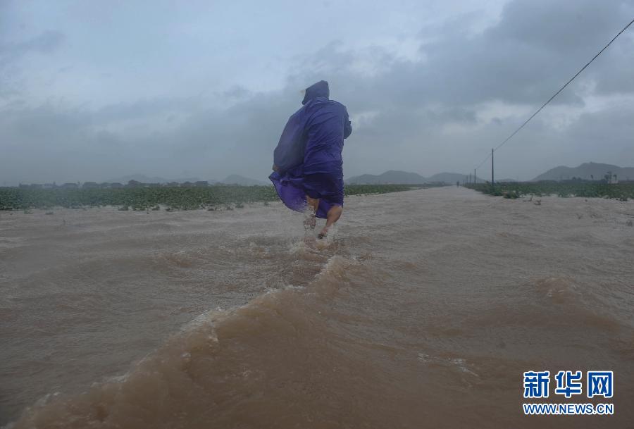 8月8日,浙江宁海县长街镇月兰村的一位村民从成片被淹的田间道路上走过。