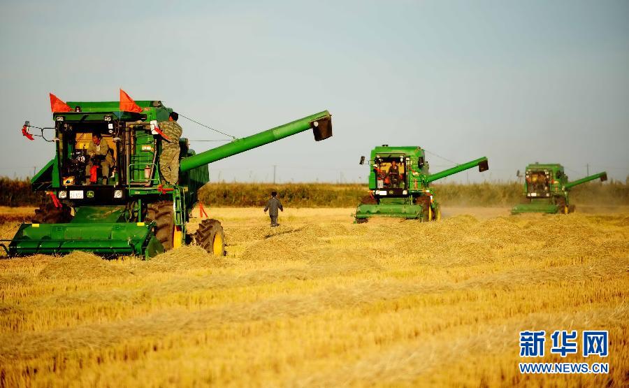 2010年9月17日,在黑龙江省八五六农场,几台大型拾禾机械进行作业。国家统计局16日发表的一份经济社会发展成就报告称,党的十六大以来,在科学发展观引领下,我国转变经济发展方式不断迈出新步伐,经济发展从“快字当头”到“好字优先”有序转化,经济发展的全面性、协调性和可持续性明显增强。新华社发