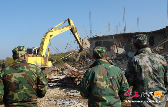 宁海新闻网讯 近日,跃龙街道会同县城管、国土资源、公安等部门联合执法,拆除了位于辖区双溪自然村后山中的一处违法建造的寺庙,打响了今年全县庵堂庙宇违章整治第一战。据悉,该庙宇原先为一座小庙,未经有关部门审批,就擅自大兴土木,违建总占地面积近8亩。 (惠广亮华建平摄)