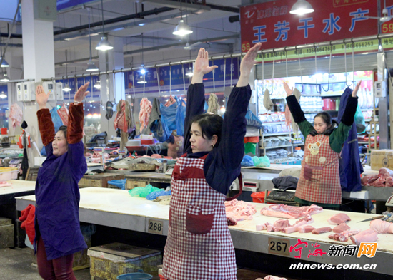宁海新闻网讯 跃龙菜市场的摊主阿姨们,天天都会利用午后顾客不多的空闲时间,一起做做健身操,活动一下筋骨。近年来,百姓的健身意识越来越强,许多人都会因地制宜、抽出时间来活动身体,多运动更健康。 (记者惠广亮 摄)