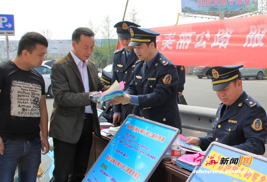 近日,县公路局在高速公路宁海出口启动了“建设美丽公路、服务公众出行”路政宣传月活动,针对性地开展公路涉路知识宣传咨询,以提高群众的爱路护路意识,广泛争取社会各界对路政管理工作的理解和支持。(惠广亮杜娟摄)