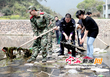 宁海新闻网讯 昨日上午,县公安局的几十名民警来到一市镇东岙村,与一市边防派出所的官兵和村民一起,清除东岙溪两侧及溪床上的垃圾,让东岙溪的水更净、更清。(李江林周国亮周如歆摄)