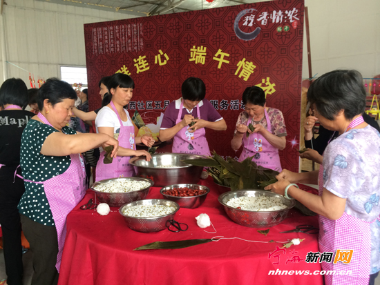 昨天,桃源街道湖西社区邀请社区居民一起包粽、钩香袋,还在老年协会开展免费理发等便民服务。 (叶子王琛摄)