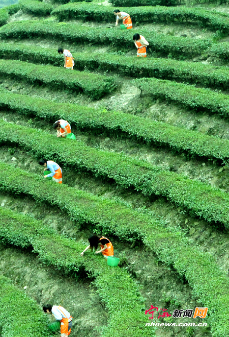 宁海新闻网讯 日前,茶院乡的妇女们正在茶园采摘夏茶。据了解,茶叶可分为春茶、夏茶、秋茶,夏茶由于新梢生长迅速,容易老化,茶叶中的氨基酸、维生素的含量明显减少,花青素、咖啡碱、茶多酚含量明显增加,味显苦涩,该乡生产的茶叶除少数在市场销售外,绝大多数珠茶远销非洲地区。(李江林郭遐曦摄)