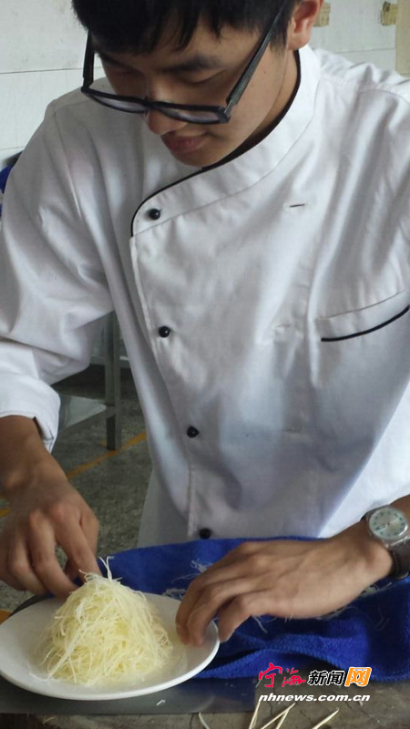 ![]() ![]() 王敏韬刀工了得,切的土豆丝比牙签还细 ![]() 这就是参赛作品“心心相印” 县职教中心2012届毕业生王敏韬获得第七届全国烹饪技能大赛特金奖了!这则消息就像长了翅膀的鸟儿,在县职教中心飞旋。 记者了解到,全国烹饪技能大赛参赛选手一般都是行业内的精英人士,有的则是十几年甚至是二十几年的“大师傅”,而作为学生代表参加大赛并能获奖的屈指可数。那么王敏韬是如何炼成这特金奖得主的呢?趁着他回母校和学弟学妹们分享经验的机会,记者采访了他。 眼前的王敏韬是一个清秀帅气的男孩,目前就读于浙江农业商贸技术学院。不说话的时候,总是一脸微笑看着你,似乎在等着你的发问。一旦说起自己选的烹饪专业,他就打开了话匣子。 小时候因为看到妈妈做菜,感觉是一件很有意思的事情,在进入县职教中心后,便选择了烹饪专业。“开始以为学这个专业马上就可以做菜,想象着将各种材料烹制在一起,做成一道道佳肴,想着就开心。”可现实是,进入烹饪班的学生往往得从最基础的刀工开始:切土豆丝。王敏韬回忆说,记得每次训练时,老师都会端来满满三大脸盆的土豆(估计有四五十斤),先切片再切丝,每一刀厚薄、宽度都要差不多,一堂实训课一站就是三四个小时。“刚开始的时候切的土豆丝粗细不一,有的只能算是土豆条,对自己也越来越不满意,甚至都有点想放弃这个专业了。”发现王敏韬的消极情绪后,班主任林亚娟第一时间找到了他,并不断做他思想工作,鼓励他,给他打气。“在指导老师和班主任老师的鼓励下,大概一个月后,我终于可以将土豆丝切成老师要求的那样——油炸后像头发丝一样细。”王敏韬说。 有了基本功后,王敏韬又开始学拼盘。记得自己第一份作业是“蝶恋花”,花了很大的心思做成后,老师点评说:刀工不错,但缺少精神。听了老师的话,天生爱钻研的王敏韬为了寻找这个“精神”捧起了古典文学,开始研究中外名画,有时候甚至还会盯着花丛中的蝴蝶看得入神。“其实做菜并不是把原材料加上调料烹制起来就可以了,里面包含的东西很多,一道好的菜就是一件好的艺术品。”王敏韬说,这次参加全国烹饪技能大赛自己选的主题是“心心相印”,这个题材寓意好,而且在搭配上也注重荤素搭配,得到了评委的好评。 马上面临就业选择的王敏韬,对于母校心怀感恩,他说,如果没有在县职教中心几年的基本功训练,自己的成绩也不会那么好。“不管以后自己走到哪儿,母校依然是我心里最大的依靠。”王敏韬也希望学弟学妹们,不管学哪个专业,自己的兴趣最重要,兴趣加上恒心去训练,一定能在自己的专业领域有所造诣。(记者潘旭婷) |