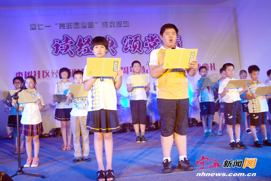宁海新闻网讯 日前,杏树社区经典诵读班成立十周年暨庆七一“读经典、颂党情”为主题的文艺晚会在柔石中学举行,居民们以歌舞、经典朗诵等形式,来纪念社区经典诵读班成立十周年,庆祝党的生日。(李江林徐海蓉摄)