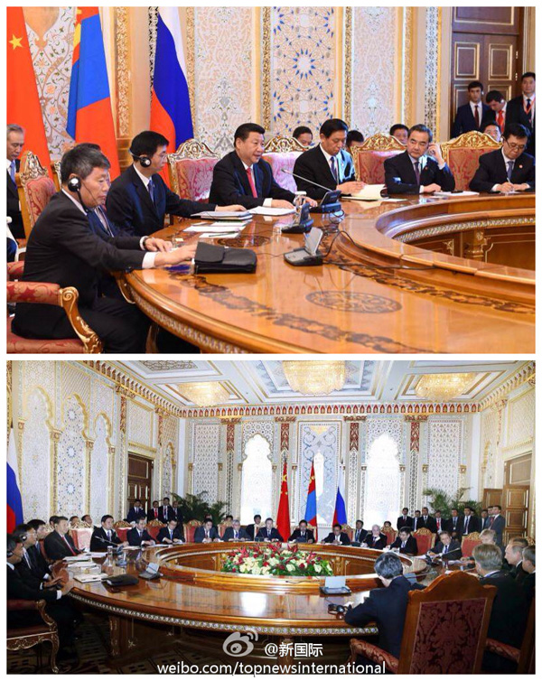 新华网北京9月12日电据新华社“新国际”微博报道,国家主席习近平11日在出席中俄蒙三国元首会晤时说,中方提出共建丝绸之路经济带倡议,获得俄方和蒙方积极响应。我们可以把丝绸之路经济带同俄罗斯跨欧亚大铁路、蒙古国草原之路倡议进行对接,打造中蒙俄经济走廊。