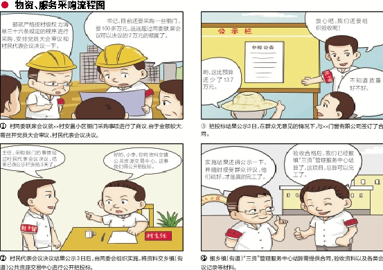近年来,随着美丽乡村建设、“五水共治”等工作的开展,一些村干部滥用权力、工程腐败等现象有所增加,村级小微权力亟须规范。今年3月,在第二批党的群众路线教育实践活动中,宁海将涉及村集体管理事务的19个事项和17项便民服务举措,汇编成《宁海县村务工作权力清单三十六条》,进一步规范农村小微权力运行,给百姓一个明白,还干部一个清白。 制度的生命力在于执行。保障“三十六条”有序运行,除党委、政府强有力的监管外,还需要充分发挥群众监督作用,倒逼村干部认真执行,真正把权力关进制度的笼子。 宁海县委、县政府在组织镇街、村干部进行“三十六条”应知应会考试的基础上,特地绘制了122幅通俗易懂、形象生动的漫画,编制解读“三十六条”的小册子,挨家挨户送到群众手中,让老百姓明白什么该监督、如何来监督。 如今,不管是村民家中、村里聊天长廊,还是村级便民服务中心,随处可见“三十六条”权力清单的内容和漫画。写在纸上、绘在图上的“三十六条”,逐渐成为群众考量干部的一把“标尺”,无形中构筑起有力的外部监督。 实践证明,只要群众发动起来,再难的事情都好办。监督也是如此,群众的积极性调动起来,任凭时光荏苒,这项制度仍能一以贯之地坚持下去。 本报今天选登其中部分漫画,以飨读者。 ![]() ①村两委联席会议就××村安置小区铜门采购事项进行了商议,由于金额较大,需召开党员大会审议、村民代表会议决议。 那就严格按村级权力清单三十六条规定的程序进行采购,安排党员大会审议和村民代表会议决议一下。 书记,目前还要采购一些铜门,要100多万元,远远超过两委联席会议可以决议的2万元的额度了。 ②村民代表会议决议结果公示3日后,由两委会组织实施,将资料交乡镇(街道)公共资源交易中心进行公开招投标。 ③招投标结果公示3日,在群众无意见的情况下,与××门窗有限公司签订了合同。 ④报乡镇(街道)“三资”管理服务中心结算需提供合同,验收资料以及各类会议记录等材料。 主任,采购铜门的事情经过村民代表会议决议,结果已在公示栏张贴3天了。 好的,小李,你将资料交镇公共资源交易中心,这事我们得公开招投标。 哟,这比预算还少了13.7万元。 放心吧,我们还要组织验收呢! 不知道质量好不好。 实施结果还得公示一下,并随时接受群众评议,他们说好,才是真的完工了。 验收合格后,我们已经报镇“三资”管理服务中心结算了,这项目,总算可以完工了。 ●物资、服务采购流程图