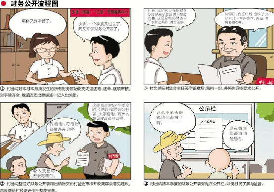 ![]() 那你又要辛苦了。 小余,一个季度又过去了,我又来领财务公开表了。 ①村出纳对本村本月所发生的所有财务原始收支凭据逐笔、逐单、逐项审核,对手续齐全、规范的支出票据逐一记入出纳账。 ③村出纳在村监会主任签字盖章后,留档一份,并将内容按要求公开。 我看看,每笔账都做进去了吗? 收入支出可都要写明白。 这是我们村这个季度的出纳账和财务公开表,大家看看,有什么意见建议都可以提。 社长,我们已经根据群众反馈的意见建议进行整改完善,这是最终的财务公开表和出纳账,请您签字。 做得好,我签好后,别忘了交给村监会主任签字、盖章,并按要求公开。 这么小笔头的钱他们都写了啊。 现在每笔账都清清楚楚的。 ●财务公开流程图 ②村出纳整理好财务公开表和出纳账交由村监会审核并收集群众意见建议,再反馈给村经济合作社整改完善。 ④村出纳将本季度的财务公开表张贴在公开栏,以便村民了解与监督。