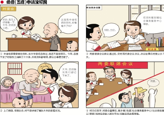 ![]() ①申请低保需要哪些资料,张大爷曾经咨询过,但还不是很明白。今年,县里下发了村级权力清单三十六条,所有资料都写明,群众办事更方便了。 ②上门调查、邻里走访,村干部详细了解张大爷的家庭状况。 ③两委联席会议商议通过后,交村民代表会议决议,决议结果在村里公示7天。 ④村主任签字、村委会盖章后,报乡镇(街道)社会事务服务中心(社会救助窗口)审核(相关信息输入核对平台)后报县民政局审批。 好的,我马上仔细看一下,大爷,您就放心吧。 这是我申请低保的资料,你看看齐了吗? 大爷,您的情况我们都记下来了。 同意。 把资料报到镇社会事务服务中心审核。 好的,主任。 ●低保(五保)申请流程图