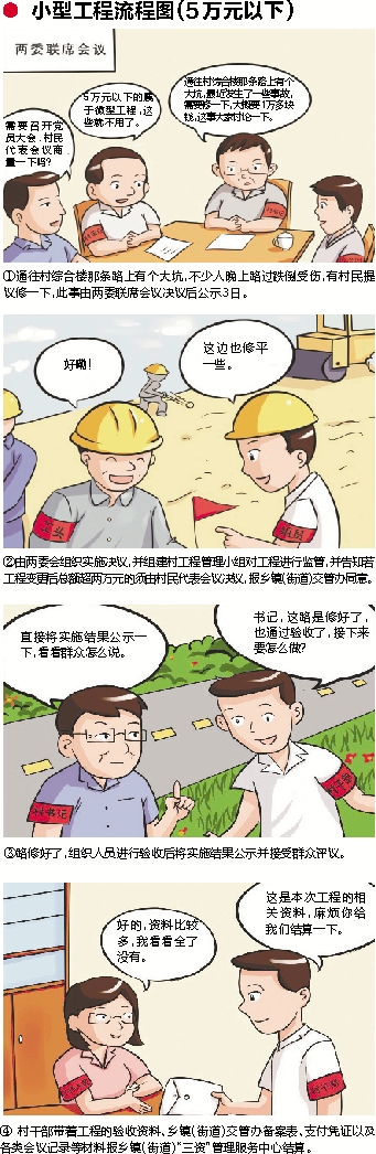 ![]() ●小型工程流程图(5万元以下) 需要召开党员大会、村民代表会议商量一下吗? 5万元以下的属于微型工程,这些就不用了。 通往村综合楼那条路上有个大坑,最近发生了一些事故,需要修一下,大概要1万多块钱,这事大家讨论一下。 好嘞! 这边也修平一些。 直接将实施结果公示一下,看看群众怎么说。 书记,这路是修好了,也通过验收了,接下来要怎么做? 好的,资料比较多,我看看全了没有。 这是本次工程的相关资料,麻烦你给我们结算一下。 ①通往村综合楼那条路上有个大坑,不少人晚上路过跌倒受伤,有村民提议修一下,此事由两委联席会议决议后公示3日。 ②由两委会组织实施决议,并组建村工程管理小组对工程进行监管,并告知若工程变更后总额超两万元的须由村民代表会议决议,报乡镇(街道)交管办同意。 ③路修好了,组织人员进行验收后将实施结果公示并接受群众评议。 ④村干部带着工程的验收资料、乡镇(街道)交管办备案表、支付凭证以及各类会议记录等材料报乡镇(街道)“三资”管理服务中心结算。