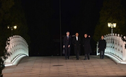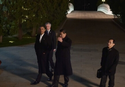 (3)能来这个地方散步,奥先生自己估计也没想到。 在西方眼中,中南海是神秘的地方。他看着哪都新鲜。散步的时候,他问习大大在哪里办公?习大大指着身后:在那里办公。 奥先生实在地接话说:我也在白宫散步,但是没有瀛台这么大圈。 说到这,想起一个插曲。奥先生的官方摄影师皮特,跟了美国好几任总统了。聊起天来,他说从来没想到会走到中南海这么核心的地方。天很凉,他冻得一直抽鼻涕,就是舍不得到屋里去。 夜游期间,有几个镜头特别美。 一个是会见前,两人在涵元殿前合影。皓月当空,涵元殿在皎洁的月光下愈发辉煌、尊贵。奥先生触景生情,他问在场的美国记者,对瀛台感觉如何?记者们大声说:特别美! 另一个镜头是,宴会前,习大大打开香扆殿窗户,向奥先生介绍窗外中南海景色。凭栏远眺,奥先生想什么呢?泱泱中华,浩浩历史,是不是很能拨动心弦? 宴会后,他俩又步行来到迎薰亭茶叙。途中,路过有2亿年历史的树化玉化石,让奥先生啧啧赞叹了一番。 到了晚上11点,夜色深沉时,他俩才走出迎薰亭。 不知什么时候起风了。初冬的夜风,寒意逼人。中南海水波荡漾,岸边柳条在风中飞舞。风吹起了习大大和奥先生的大衣衣角。 这时候,有位工作人员上前,不失时机地推销电瓶车(其实人家是真心关心两位元首,怕他们着凉)。 没想到,他俩异口同声地说:不需要乘车! 就这样,他们扣紧衣领,边走边聊,一口气走到了瀛台桥北。 太晚了,总不能秉烛彻夜长谈吧?明天一早还得见面呢! 两国元首握手话别。 奥先生用了非常动情的一句话概括:今晚,我这辈子最全面、深入了解到中国共产党的历史和执政理念以及您的思想。 奥先生上了车,他俩隔着车窗挥手告别。习大大在风中站着,目送奥先生缓缓离开。