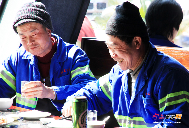 已从事环卫工作15年的谢体军一边开心地夹着菜,一边接受记者的采访:“这可是第一次有饭店请我们环卫工人吃饭呢。菜真好吃,老板也很热情。今天虽然是小年,但比大年三十还开心。”坐在一旁的张水钱来自江西鄱阳,在宁海干这一行已经5年了。当被问及是否回家过年时,他说:“春节我们也照常保洁,我打算出了年3月份再回老家。今天和同事们一起吃年夜饭很高兴,因为妻子也在老家,往年年夜饭就自己一个人随便吃的。”环卫工人中有很多是夫妻档,其中一位叶国安大伯,他的妻子因为轮班放弃了这次难得的机会。