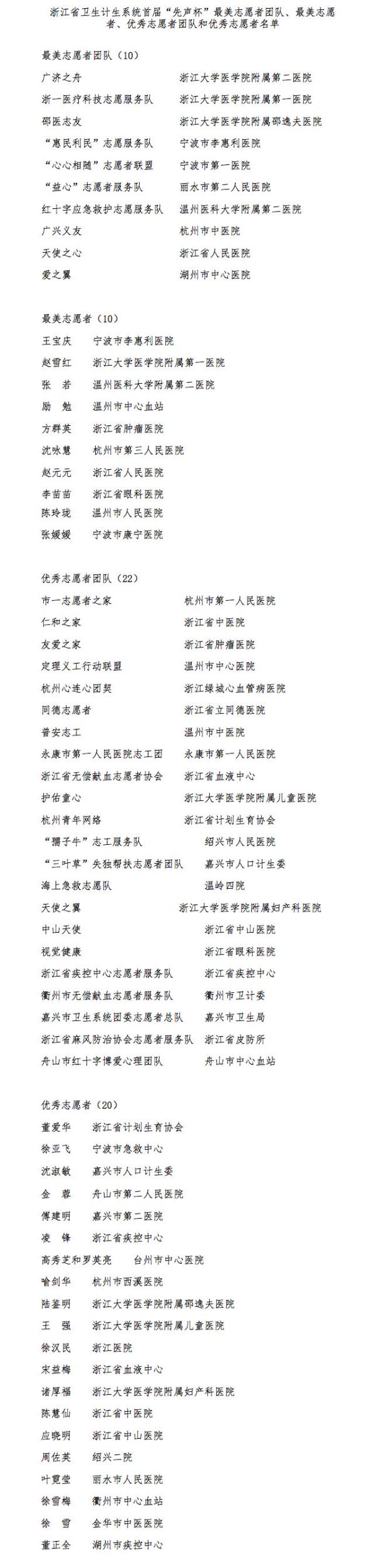 经过几个月推选和网络投票,最终产生10支最美志愿者团队和10名最美志愿者个人,以及22支优秀志愿者团队和20名优秀志愿者个人。 “医疗志愿服务架起了医患沟通的桥梁,对深化医改、促进医患和谐意义重大,志愿者们是医患关系的润滑剂,下一步我们将继续努力壮大志愿者队伍。”浙江省卫生计生委党组书记、主任杨敬说。