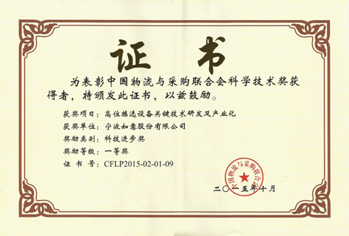 2015年度中国物流与采购联合会科学技术奖评审会于9月24日在北京召开。由11位专家组成的评审小组在网评的基础上进行了1天的集中会审,并提交评审委员会审议。最终评出本年度科学技术一等奖23项,二等奖51项,三等奖71项。我公司上报的“高位拣选设备关键技术的研发与产业化项目”最终荣获一等奖。2015年度中国物流与采购联合会科学技术奖评审会于9月24日在北京召开。