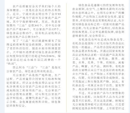 ![]() ![]() ![]() ●记者赵燕 农产品质量安全关乎我们每个人的身体健康,一直是社会关注的热点和焦点。近日,宁波市农业局公布了全市93个农产品产地为宁波市无公害农产品产地,其中宁海新增14家,至此,我县有效期内“三品”总数301个,其中无公害农产品产地140个,无公害农产品137个。绿色食品总数15个,经有机认证机构认证的有机产品总数为9个。 有了“三品”标识就意味着有了信得过的质量和安全的保障,同时也拥有了老百姓的信任。据农业部市场调查显示,大中城市消费者对绿色食品品牌的认知度和信任度已经超过70%和80%,绿色食品已经成为城市居民消费的一个“热词”。 那么何为“三品”?“三品”是指无公害农产品、绿色食品和有机食品。 无公害农产品是指产地环境、生产过程、产品质量符合国家有关标准和规定的要求,经认证合格获得认证证书并允许使用无公害农产品标志的未经加工或初级加工的食用农产品。无公害农产品标志图案由麦穗、对勾和无公害农产品字样组成。麦穗代表农产品,对勾表示合格,金色寓意成熟和丰收,绿色象征环保和安全。 绿色食品是遵循可持续发展和有机农业原则,在空气、土壤和水源均无污染的生态环境之中,应用无公害生产的操作规程,产出和加工出的安全优质、富有营养,并经绿色食品发展机构认证,允许使用绿色食品标志的一切食用农副产品的总称。与无公害农产品相比,绿色食品的标准更高。无公害是最低保障,绿色则意味着优质、安全和营养。 有机食品也叫生态或生物食品等。有机食品是国际上对无污染天然食品比较统一的提法。产品符合国际或国家有机食品要求和标准;并通过国家有机食品认证机构认证的一切农副产品及其加工品,包括粮食、食用油、菌类、蔬菜、水果、瓜果、干果、奶制品、禽畜产品、蜂蜜、水产品、调料等。有机食品的主要特点来自于生态良好的有机农业生产体系,生产和加工不使用化学农药、化肥、化学防腐剂等合成物质,也不用基因工程生物及其产物。因此,有机食品是一类真正来自于自然、富有营养、高品质和安全环保的生态食品。 不过,无公害农产品与大家想象的可能有点差距,比如很多人认为无公害蔬菜不打农药,其实这是误解。按规定无公害蔬菜种植可以使用农药,只是要按规定选择品种和用量,上市前要经过间隔期,确保农残降到安全标准。也就是说,无公害农产品并不是“高大上”的概念,而是能保证人们对食品质量安全最基本的需要,是最基本的市场准入条件。理论上来说,只要是上市销售的蔬菜都应达到这一要求。 消费者购买农产品时,可以查看包装上的无公害农产品标志,通过标志上的16位防伪数码判定真伪。这个标识里还带有生产的信息,能了解认证产品的生产厂家、产品名称、品牌等相关信息,等于给蔬菜配上“身份证”,让市民一看就知道它“家”在哪儿。 相比无公害农产品,绿色食品、有机食品一般身价不菲。专家强调,一般绿色食品、有机食品多是在中高端的精品超市销售,外包装上有绿色食品、有机食品标识,利用标识上的代码可以上网辨真伪,确保买到的绿色蔬菜货真价实。 此外,为了在源头上构筑起农产品质量安全的另一道“防线”,记者还了解到,我县跃龙、龙海、南门、兴宁、梅林、长街、西店和东门8个农贸市场都有检测室,全面推出一周两次的免费检测活动,时间为每周二、周四,市民可以将自己在任意地点采购来的农产品带到市场进行免费检测,让宁海老百姓吃得更放心。 |