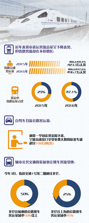 长途汽车客运站购票处客人寥寥。(张燕 付君 摄) “去杭州的大巴车乘客数量,真不能和以前比了。”上周,市民虞小姐要去杭州汽车北站附近办事,选择了坐大巴车前往,令她印象深刻的是,现在的大巴车生意清淡了很多。 虞小姐清晰地记得十多年前在杭州求学时的情景。那时候,汽车南站还没有改造,虽然旧了点,但乘客熙来攘往。一楼是给象山、宁海等地“近郊”乘客的;二楼是往上海、杭州方向的“专区”,高峰时大概十分钟左右就有一趟汽车开出,三四十座的大巴车坐得满当当的。 现在,虞小姐依然经常去杭州出差,但她基本上会选择坐高铁前往。“高铁班次很多,二等座的价格比大巴车贵上几元,但无论是速度还是舒适度,高铁都胜过大巴。”她说,这次如果不是办事的地点正好在杭州汽车北站附近,她还是会选择坐高铁前往的。 像虞小姐这样“舍大巴选高铁”的乘客,在宁波并不少见。面对高铁的快速发展和私家车的普及,公路客运面临着客流量连年下滑的严峻形势。 为了在高铁、私家车这个“夹缝”中求生存,并寻求新的增长点,中长途客运需要来一场“修行”。 高铁发力突飞猛进 昨天,我国铁路运行图启动了近10年来最大范围的调整。在大量增开旅客列车的同时,铁路部门还将对列车开行结构进行全面优化。中国铁路上一次调图是在今年初,调图后宁波站开行旅客列车111对,其中动车组96对。宁波铁路经过上一轮五年建设,全市铁路里程增加了106公里,总里程达到360公里…… 走进铁路宁波站候车室,宽敞的大厅内“开始检票”的报站声此起彼伏,人们或静坐等车,或排队过安检。对于旅客运输,春运的数据最能说明情况:由于打工者减少、返乡时间拉长等原因,近年来我市春运客流总量呈下降态势,但铁路客流却在不停增长:2015年春运,铁路完成客运量423.3万人次,同比上升8.4%;2016年春运,这一数据继续高速增长,铁路旅客运输量达496.7万人次,上升17.5%。 铁路的快速增长,是在“阵痛”中进行的。上世纪90年代,高速公路快速发展,铁路在2007年前进行了六次大提速来“护市”。从2010年开始,高铁技术的发展使铁路主动出击与公路抢市场。高铁发力,结果显而易见:2015年宁波市整个春运综合运输中,铁路运量占比由8%上升到29%;到了2016年春运,铁路客运比重上升到47.1%,列第一位。 公路班车腹背“遇袭” 春运是汽车、火车票最紧张的时候,“前几年春运总会有十几个朋友同事委托帮忙买汽车票,而今年春运,找我帮忙的只有1个人。”一名公路运输业内人士说,这一方面是公路售票途径多样化、便利化使然,但也从一个侧面说明了公路客运的不景气。 公路客运一直是中长途客运的重要力量,尤其是从上世纪末开始,高速公路的大发展,使交通运输基础设施网络规模与总体运输能力大幅提高。一条条高速公路的建成通车,也使公路客运驶上了快车道。 这样的好光景仅维持了十几年,民航、高铁、私家车甚至地铁的快速发展,使公路客运“腹背遇袭”,风光不再。“2013年7月,杭甬高铁开通,宁波到杭州的公路班车就出现了萎缩,一路下滑。”一名业内人士以“高铁线路通一条,公路班车缩一条”来形容高铁给汽运带来的冲击。 事实确实如此。以宁波到南昌为例,高铁通车后,宁波到南昌大约只要4.5小时,二等座票价327.5元;如果坐汽车,票价虽然便宜了100元左右,但需要耗时9小时。“除非对票价比较敏感,或者是在汽车行驶路线附近,不然大部分乘客总会选择坐高铁前往。”业内人士分析。记者获悉,很多高铁线路与南昌线类似,如甬台温动车组开通前,台州、温州、福州线一直是汽车班线的重点城市,“在2009年以前,从宁波到温州的班车一天有19班,都是38座的大车,可现在一天只有2班了,而且是18座的中型车。”公运集团一名工作人员介绍。目前宁波到温州的公路客运走的是甬台温高速,耗时3.5小时,而高铁只要1.5小时。今年贵州方向的高铁开通后,也给公路班车带来冲击。 另外,自驾车也分流了公路客运量。节假日小客车高速免费通行政策实施以来,很多私家车主尽情享受这一“福利”,通常一个国庆黄金周下来,宁波高速出口享受免费大餐的私家车就超过百万辆(次)。 甚至城市公共交通的发展也让班车客流受挫。今年3月,轨道交通1号线二期通往北仑,北仑往杭州的公路班车客运量减少一半以上,上海线也减少了25%。“原来,北仑与宁波火车站之间距离较远,通过公交车换乘,时间上无法把握,因此北仑到杭州、上海等周边城市的长途线路在时间上还有一定的竞争优势。但是轨道通达北仑后,‘轨道交通+高铁’在时间、服务、安全等方面已经具备公路客运难以超越的优势,行业整体受到冲击已在所难免,公路客运将面临重新洗牌。”北仑区交通运输局有关人士表示。 “小而美”的华丽转身 随着公共交通的不断发展,民航、高铁、公路这三大运输方式重新洗牌已不可避免。一般认为,800公里以上路程,民航占优势;400公里至800公里的干线客运,高铁当仁不让;而400公里以内的支线客运,公路客运有着“小、快、灵”的特点。公路班车如何避开与高铁的正面冲击,通过“小而美”的线路设计,建立起与高铁、民航互补的“生态链”,实现资源效益最大化? 将大巴车开到高铁到不了的地方,这种班车线路设计是公路客运转型的首要思路。“高铁适合目的地集中、旅客量大的两点间,如宁波和