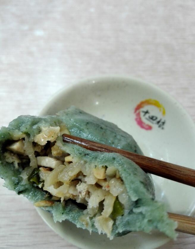 ”米团”上来了,斧头团,白团一只、青团一只。白团的粉是糯米粉,软软的,绵绵的,馅是罗卜丝馅,再加入虾皮、豆腐干丝。青团是用”青“做的,被小伙伴吃掉了,问味道如何,答:好。