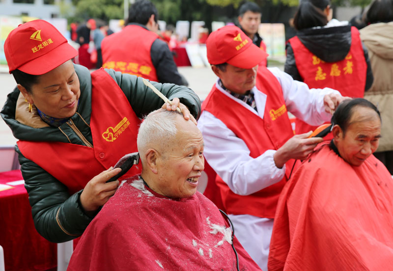 党员志愿者服务队为老年朋友认真理发。