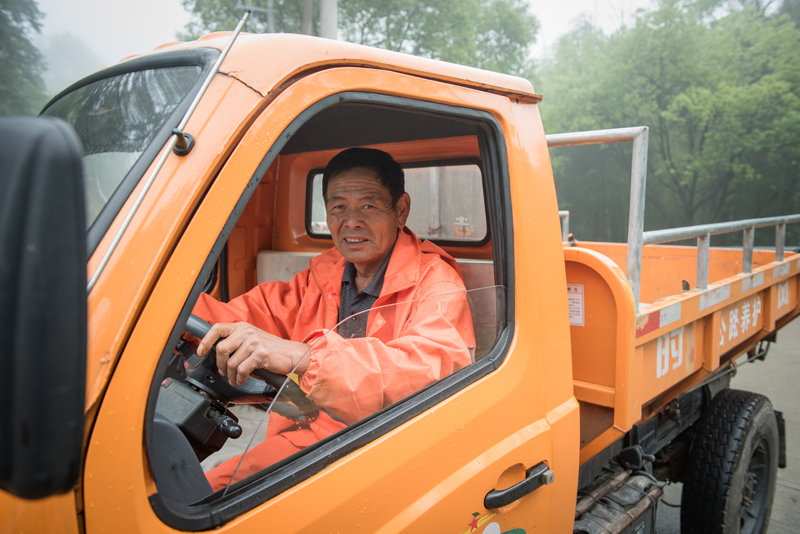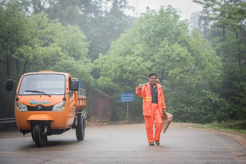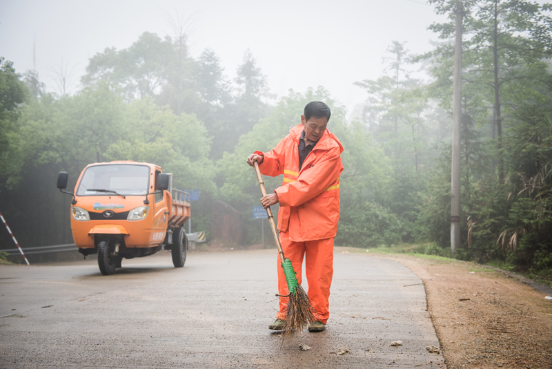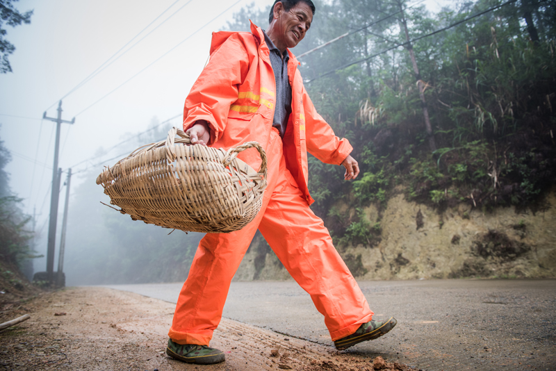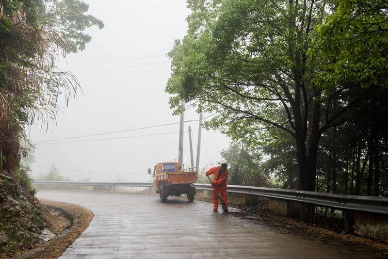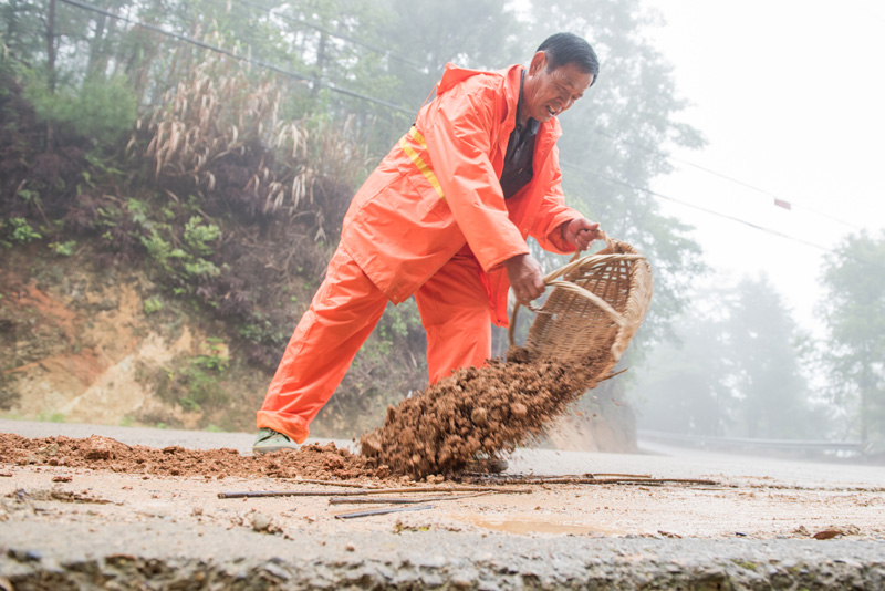 前童梁皇村党员赖法田在清理公路沟边和塌方、守护山村道路安全。