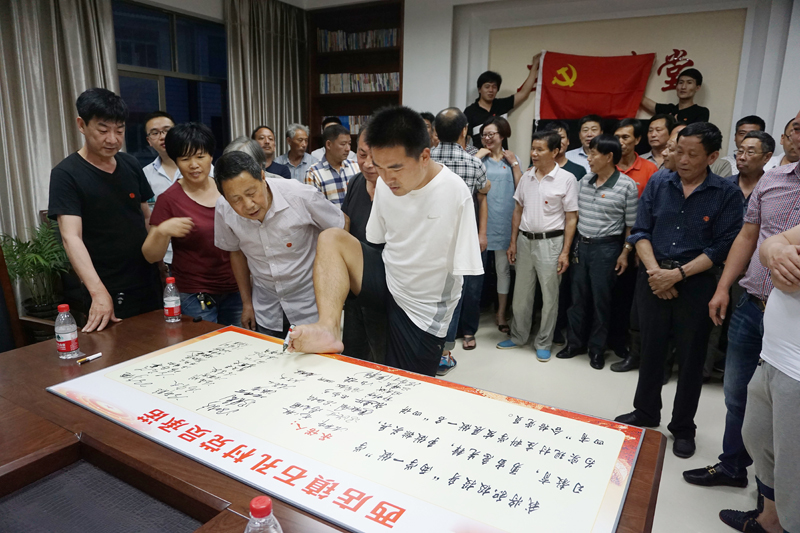 石孔村党支部无臂党员屠欢杰在承诺墙上签下庄严承诺。
