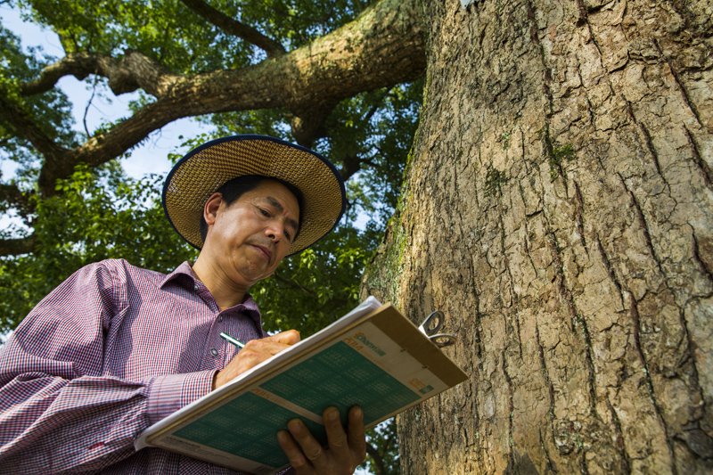 县林特总站党支部何贤平头顶烈日到水车村进行名树古木登记。