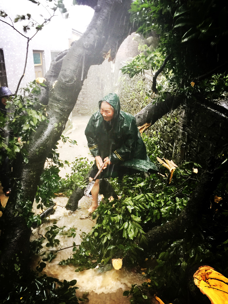 茶院道士桥党支部老党员陈邦训迎着台风收拾残枝,疏通村庄道路。