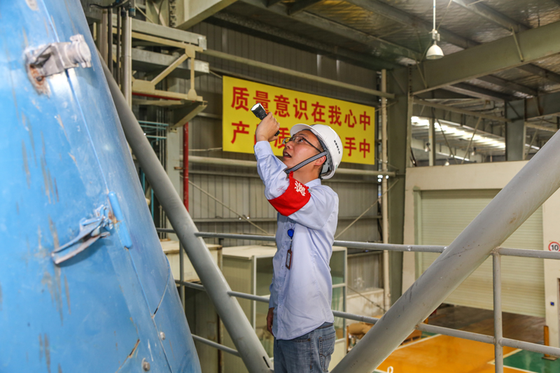浙能催化剂党支部党员薛东武在生产一线检查。