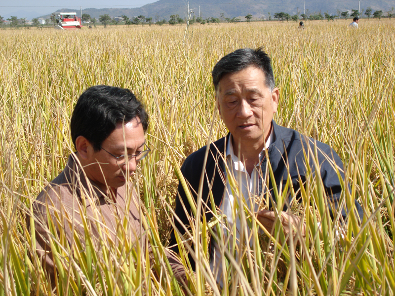 县农技总站党员查看甜瓜品比试验田与水稻超高产攻关田。