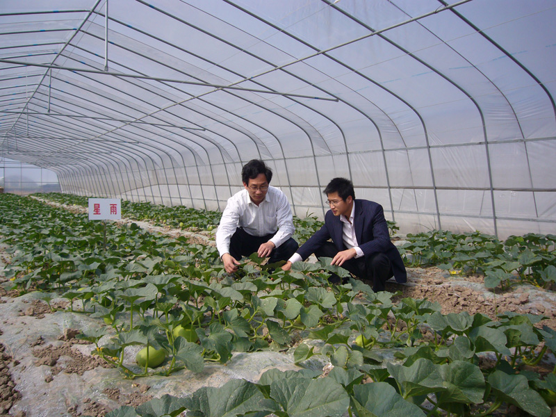 《县农技总站党员查看甜瓜品比试验田与水稻超高产攻关田》