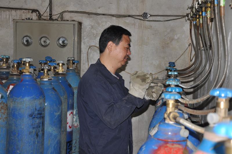 县第一医院行政后勤支部党员郑海忠在调试供氧设施。