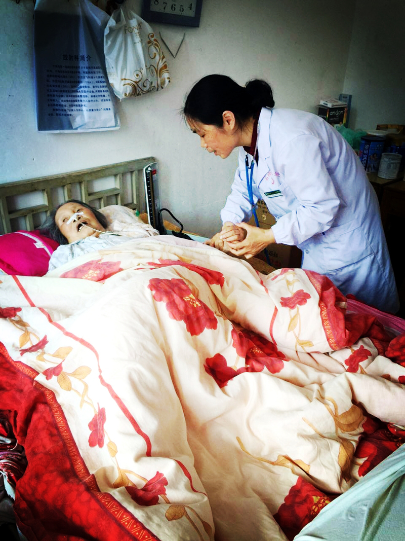 茶院乡卫生院党员护士周琼琼在患病老人家里贴心诊治。