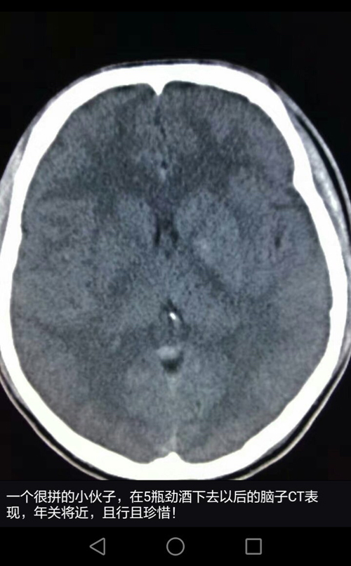 春节已进入倒计时,不少人已经开启亲朋好友聚餐聚会的吃吃喝喝模式,喝点酒助兴是必须的。但近日县第一医院一位医生发在朋友圈的一条微信震惊了众多市民和“酒友”,一位26岁的小伙子在喝完5瓶劲酒后,脑CT显示脑沟消失。这位医生在朋友圈提醒大家:“年关将近,且行且珍惜。”