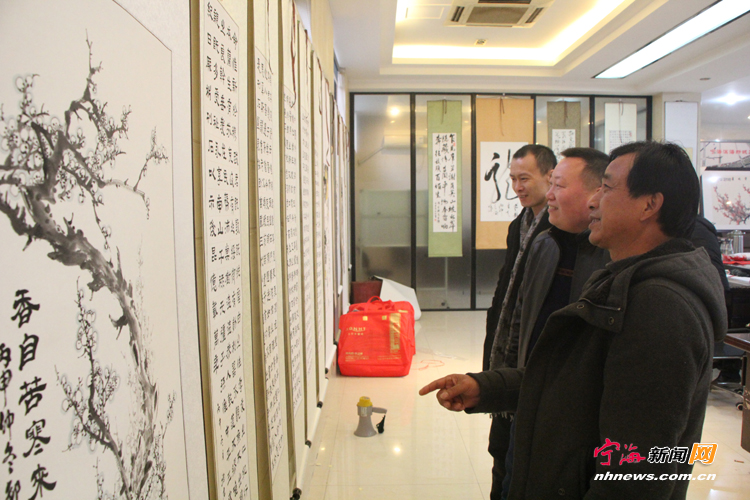 近日,桥头胡街道文联、成校、黄墩书画社共同举办了“迎新春书画展”。此次展出的60余件类型不同的书画艺术精品,全部出自黄墩书画社社员之手。 (记者何莎莎通讯员胡一宁摄)