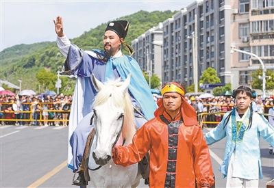 “来了,快看!”随着起立的人群一阵骚动,只见肩披斗篷,身骑白马的徐霞客扮演者缓步从远处走来,不时挥动双手告别现场群众。最终,他骑马上场,往西门方向出行,形象地再现了404年前徐霞客从宁海西门出游的情景。此时,徐霞客游线上的各种充满了欢乐、祥和、喜庆的民族歌舞把浓浓的民族情谊带给了现场每一位嘉宾,同时也展示各地山水之秀美,体现人文之精粹。