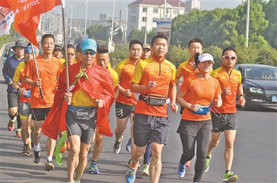 图为唐广礼(戴蓝色帽子者)和宁海跑友一起跑步。(林海摄)