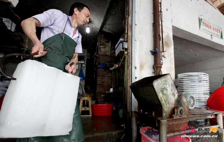 昨日,跃龙市场的冰库工人正在制作经营户必需的冰块,应对连日高温。