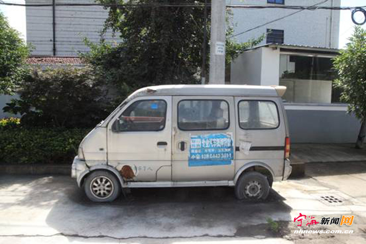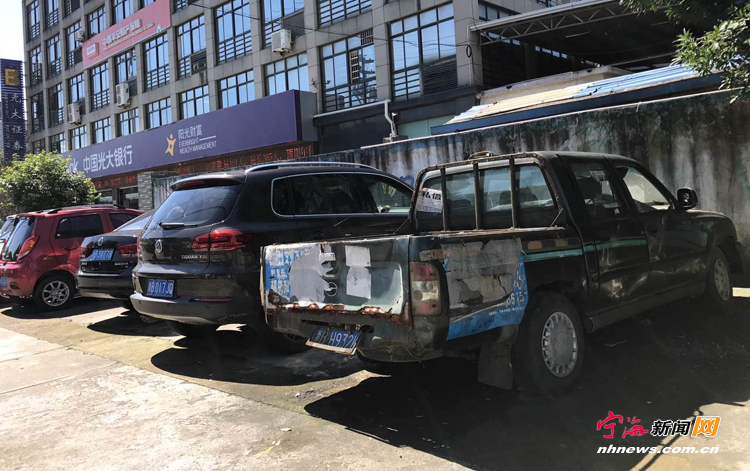 光大银行西面有一辆皮卡车,还有三辆报废车,都停了好几年了。 (薛宏摄)