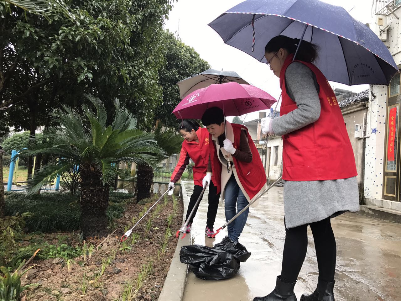 3月10日下午,县新闻中心组织全体党员赴前童镇岭南村开展消灭V类水河道清理活动,图为中心党员、巾帼岗岗员正在冒雨捡拾垃圾。