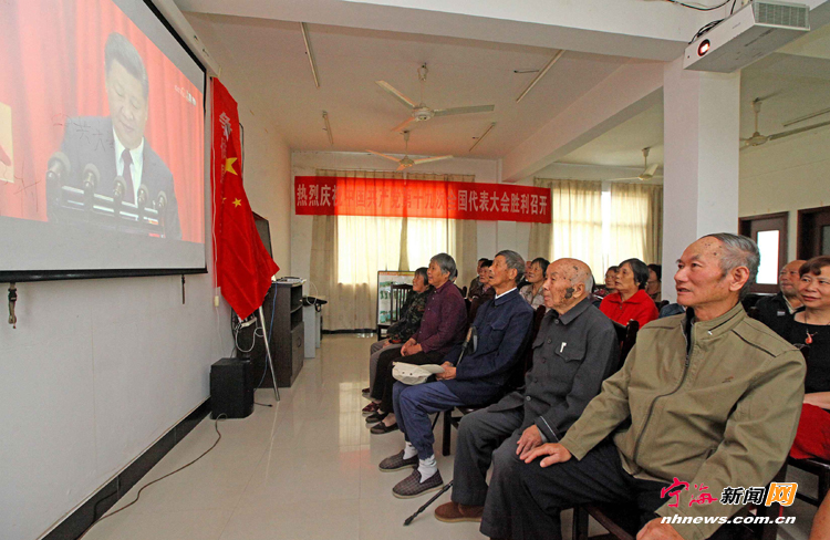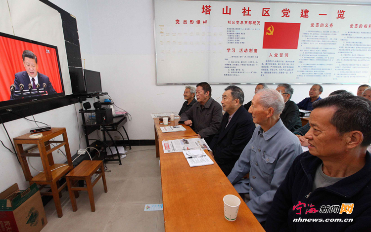 跃龙街道塔山社区的居民正在兴致勃勃地收看十九大盛会。 (记者李江林通讯员李昕摄)