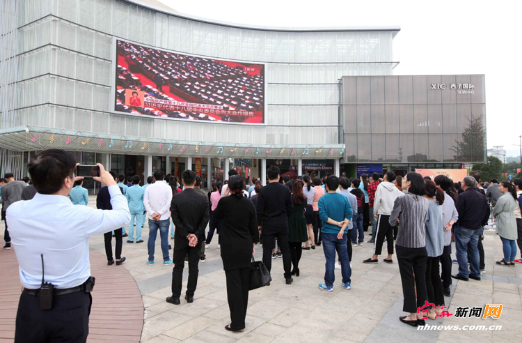众多市民自发聚集在西子国际大屏幕前收看党的十九大盛会。 (记者惠广亮摄)