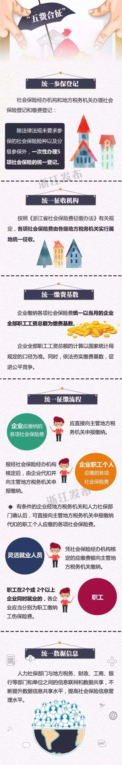 为推进社会保险费征缴法制化和规范化,浙江省政府办公厅近日印发了《关于进一步加强社会保险费“五费合征”工作的意见》,进一步加强基本养老保险费、基本医疗保险费、失业保险费、工伤保险费和生育保险费统一征收工作。