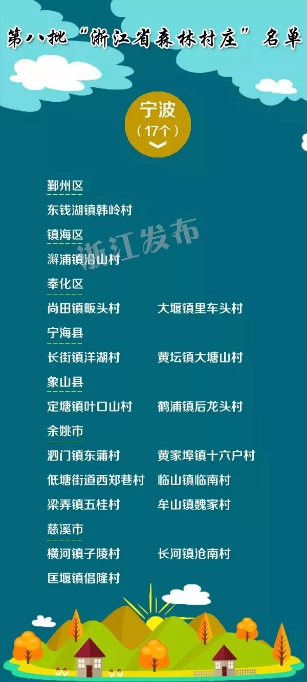 日前,浙江省关注森林组织委员会研究决定,命名杭州市余杭区良渚街道新港村等180个村为第八批“浙江省森林村庄”,予以通报表彰并颁发奖牌,其中宁波有17个。