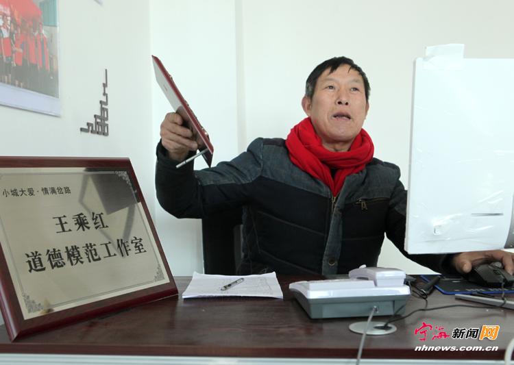他就是“上路角”农民王乘红。在岔路镇政府“王乘红道德模范工作室”,记者见到了他,饱经风霜的面容,不善言辞,一看就知道是个“忠厚人”。这个以他名字命名的工作室,也是全县首家道德模范工作室。