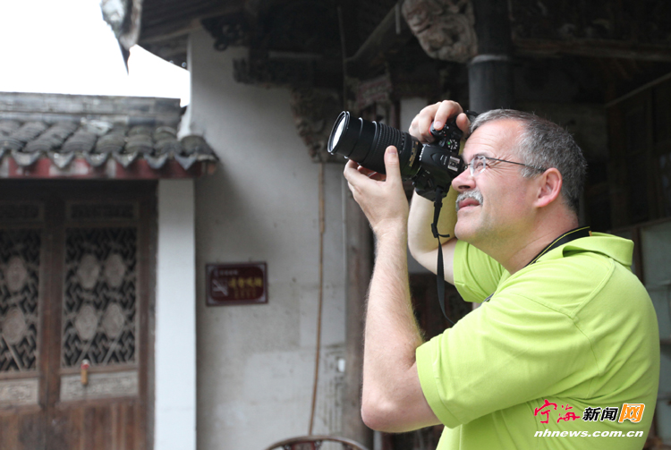 近日,一名外国游客在前童古镇正将镜头对着老房子拍摄。